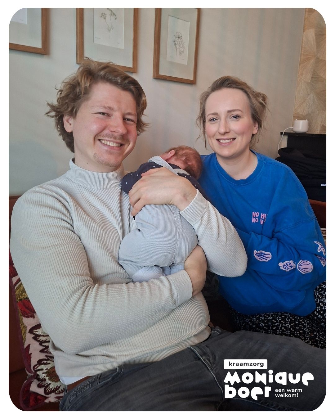 Nu zitten ze samen op de bank. Hun zoon in hun armen. Moe, maar gelukkig.